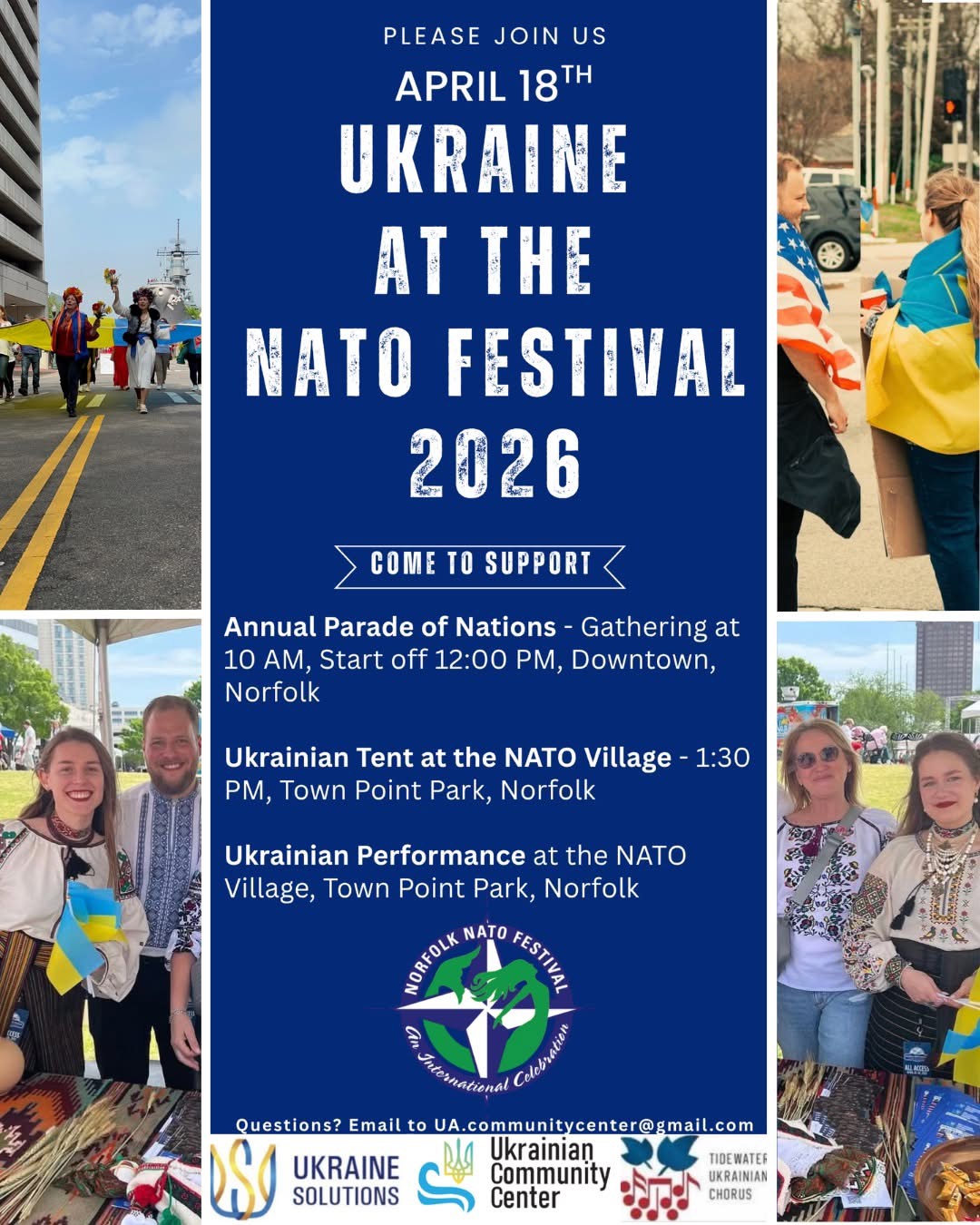 Norfolk, VACelebrate Ukrainian culture at the 2026 NATO Festival. This community event is hosted by the Ukrainian Community Center of Hampton Roads and Ukraine Solutions and invites attendees to connect, support,...