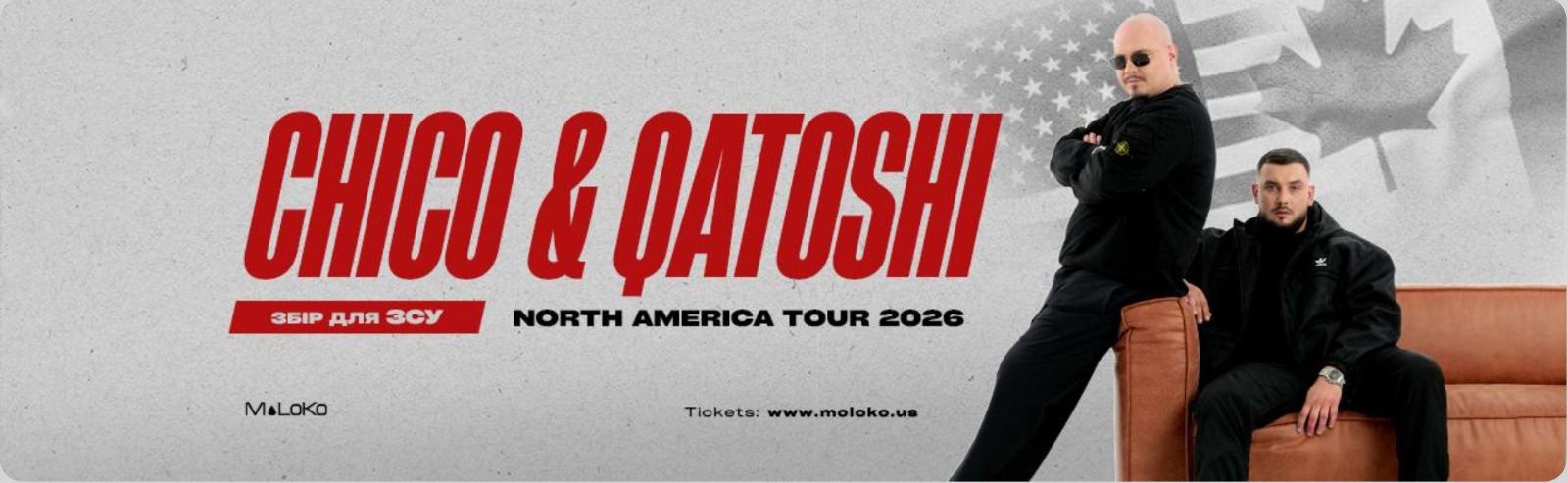 Don’t miss CHICO & QATOSHI, one of the most popular Ukrainian bands of recent years, on their first North American tour. The group behind hits like “Lastivky,” “Akatsiia,” “Mamma Mia,” “Dopomozhem ZSU,” and “Pokokhai Mene” will bring an energetic and heartfelt live show this spring. This concert promises powerful music, unforgettable эмоції, and a warm atmosphere for the Ukrainian community and all fans of modern Ukrainian music. During the tour, fundraising will also take place in support of the Armed Forces of Ukraine. Doors open at 6:00 PM, and the show starts at 7:00 PM.